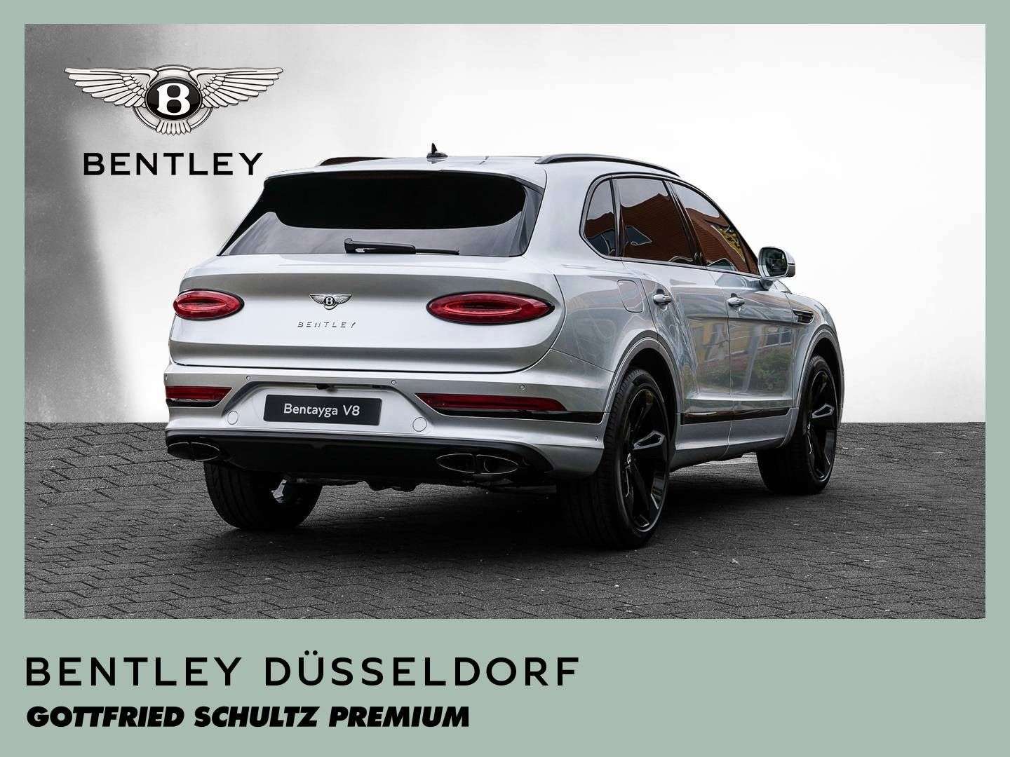 des Fahrzeuges: DüsseldorfBentley Bentayga V8NeufahrzeugFarbkombination:Außenfarbe: Moonbeam (silber)Hauptleder: Beluga (schwarz)Zweitleder: Beluga (schwarz)Furnier: Piano BlackSonderausstattung:Extended Range Lackierung in Moonbeam22“ Leichtmetallrad im 5-Speichen-Design "Directional", schwarz lackiertBlackline SpecificationTouring Specification- ACC – Abstandregeltempomat- Kollisionswarnungssystem „Bentley Safeguard Plus“- Head-Up Display- Spurhalteassistent- Nachtsichtassistent „Night Vision“- auassistent „Traffic Assist“Furnier in Piano BlackKomfortausstattung für die VordersitzePrivacy Glas - getönte Heck- und hintere Seitenscheiben3-Speichen Lederlenkrad, 1-farbig, beheiztAmbientebeleuchtunggestickte Bentley-Embleme auf den SitzenSportpedalerie hochflorige Fußmatten mit Ledereinfassung vorne und hintenBentley Dynamic Ride"Bang & Olufsen for Bentley" Highend AudiosystemLED Welcome Lamps - BegrüßungslichtGaragentoröffner, 3-fachBatterieladezustanderhaltungsgerät...Änderungen, Zwischenverkauf und Irrtümer vorbehalten.