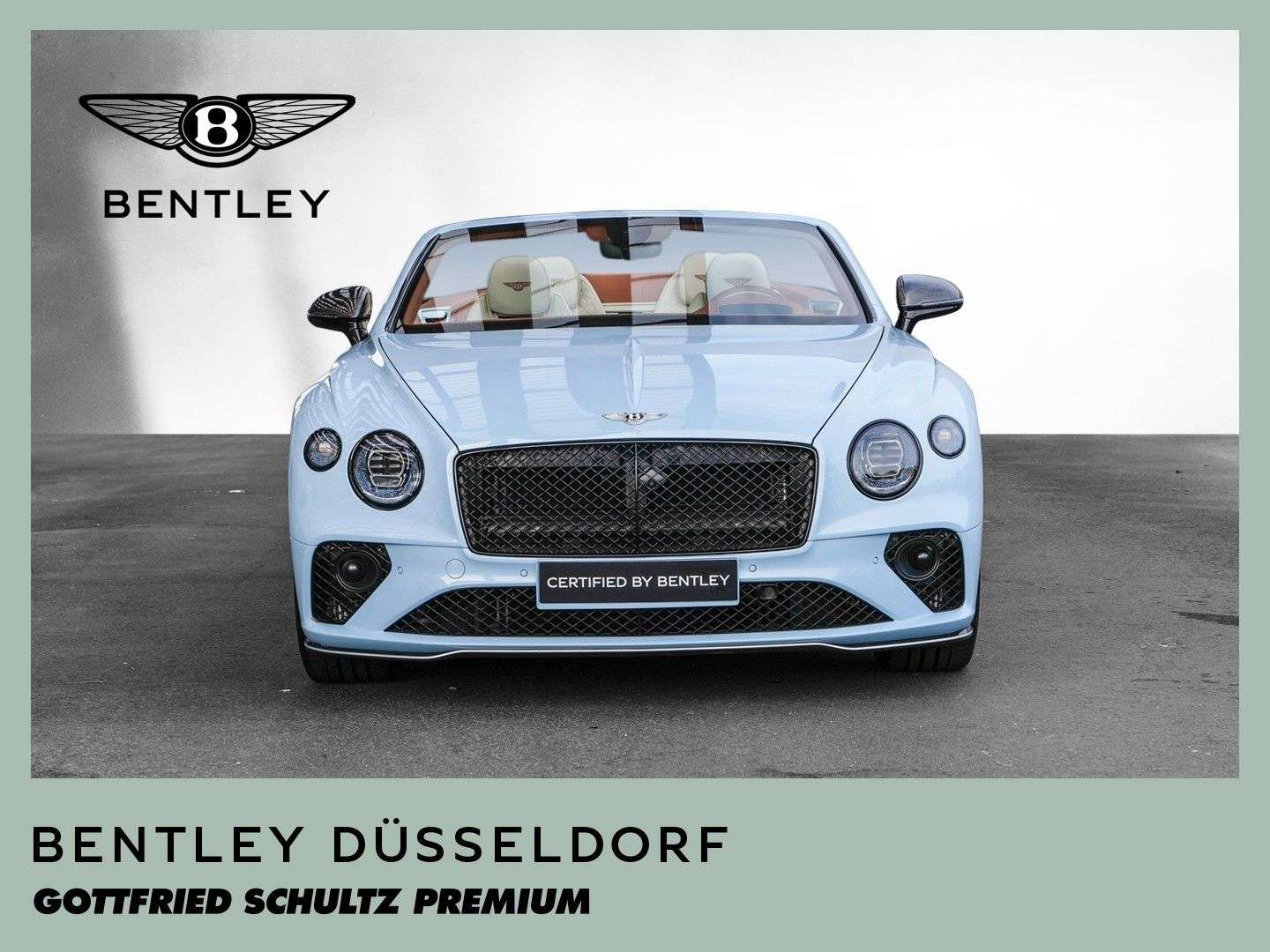 des Fahrzeuges: DüsseldorfBentley Continental GTC S V8 Fahrzeug aus VorbesitzFarbkombination:Außenfarbe: Jetstream II (babyblau)Hauptleder: Linen (beige)Zweitleder: Newmarket Tan (braun)Furnier: Carbon FibreSonderausstattung:Extended Range Lackierung in Jetstream II22“ Leichtmetallsportfelge im 10-Speichen-Design, schwarz lackiertSelbstnivellierende Bentley Embleme auf den FelgenAußendachfarbe in TweedCarbonaußenteile mit Jetstream II Akzenten versehenTouring Specificationyling SpecificationColour SpecificationKomfortausstattung für die VordersitzeSitzflächen und Türeinlagen in Leder mit DiamantsteppungFurnier in High Gloss CarbonSitzgurte in KontrastfarbeKreuzstichnähte – by Mullinerzusätzliche “Diamant-Riffelung” der LüftungseinlässeAmbientebeleuchtung inkl. beleuchtete Einstiegsleistehochflorige Fußmatten mit Ledereinfassung vorneFußmatteneinfassung in Kontrastleder3-Speichen Lederlenkrad, 2-farbig, beheizbar, mit geprägtem LederSportpedalerieLED Bodenbeleuchtung mit Bentley-Emblem vor Türen„NAIM for Bentley“ Highend AudiosystemMulliner Tankverschluss und ÖleinfülldeckelRotierendes Display, 3-FachGaragentoröffner, 3-fachBatterieladezustanderhaltungsgeräteinschlagschutzfolie (Front)Carbon Spiegelkappen...Änderungen, Zwischenverkauf und Irrtümer vorbehalten.