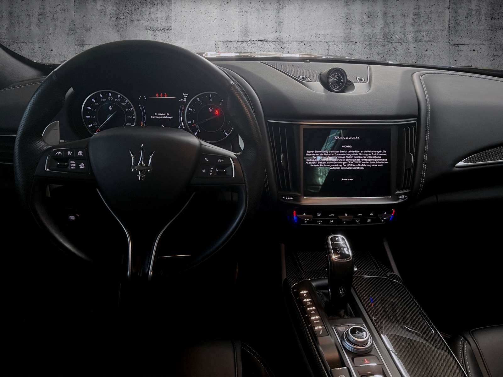 ts: 1. HandScheckheftgepflegtTechnik + Sicherheit: Luftfederung elektronisch geregeltElektronisches Stabilitäts-Programm (MSP)ABSElektron. TraktionskontrolleAutomatische FeststellbremseAirbag Beifahrerseite abschaltbarKopf-Airbag-System (Windowbag)Airbag Fahrer-/Beifahrerseite und Seitenairbag vornDiebstahl-WarnanlageDifferentialsperre (nterachse)Motor-Schleppmoment-Regulator (MSR)Innenspiegel mit AbblendautomatikAußentemperaturanzeigeFahrwerk elektronisch geregelt (Skyhook)Start/Stop-Anlageelektrische ParkbremseElektr. Bremskraftverteilung (EBD)Start-Stop-KnopfMultimedia: NavigationssystemSoundsystemFreisprecheinrichtung BluetoothUSB-AnschlussUSB und Aux-In-AnschlussMultimedia-System Maserati Touch Control (inkl. 8,4 Zoll Touchscreen-Farbdisplay, DVD-Player, SD-Karten-Schnittstelle)Telematik-System Maserati CallDAB-Tuner (Radioempfang digital)Touch ScreenSprachbedienung Smart Personal Assistent(SIRI)Assistenzsysteme:RückfahrkameraBergabfahrassistentBerganfahrhilfeGeschwindigkeitsbegrenzungsanlageSpurw (lane assist)Verkehrszeichen-ErkennungTempomat (GRA): autom. DistanzregelungTotwinkelassistent (side assist)Einparkhilfe Plus vorn und hintenTrailer AssistLicht- / RegensensorGeschwindigkeitsregelanlage (GRA) TempomatNotbrems-Assistent (BAS)FrontkameraSeitenkameraInnen: Klimaanlage manuellKlimaanlage motorbetriebenLederausstattungStaub- und PollenfilterLenkrad mit Schaltwippen/-tastenLenkrad (Sport/Leder - 3-Speichen) mit Multifunktion, Lederfarbe schwarzelektrische Fensterheber vorne + hintenBordcomputer mit FarbdisplayFensterheber elektr. 4*Gepäckraumabdeckung / RolloKlimaautomatik 2-ZonenFußmatten VeloursSportlenkradLenkrad beheizbarLenksäule (Lenkrad) elektr. verstellbar (vertikal / axial)Dachhimmel StoffSitze + Polster: SitzheizungSitzheizung vorneMittelarmlehne hinten mit GetränkehalterMittelarmlehne vorn mit klimatisiertem Staufach und 12V-AnschlußSportsitze vorn elektr. verstellbar (links mit Memory)belüftete Sitz(e)Aussen: Zentralverriegelung mit FernbedienungStoßfänger / Radkästen / Seitenschürzen WagenfarbeAnhängekupplungAußenspiegel elektr. verstell-, heiz- und anklappbarZentralverriegelung mit Funkfernbedienung Keyless EntryKeyless-Entry & GOAnhängekupplung abnehmbarDoppelverglasungKofferraumdeckel / Heckklappe elektrisch betätigt (öffnen + schliessen)Scheinwerfer + Leuchten: Heckleuchten LEDHeckleuchten LED, abgedunkeltMatrix-LED-ScheinwerferAbbiege-/KurvenlichtTagfahrlicht LEDNebelscheinwerfer LEDRäder + Reifen: Reifendruck-KontrollsystemLM-FelgenLeichtmetallfelgen: 21"Sonstiges: Bremsanlage: BremboSoft-Close-Automatik für TürenPedalerie elektr. einstellbarBremsassistent (HBA)Parkbremse elektrisch (EPB)Steckdose (12V-Anschluß) im FondBremssättel Schwarz lackiertBergabfahr-AssistentRadstand 3004 mmÄnderungen, Zwischenverkauf und Irrtümer vorbehalten!