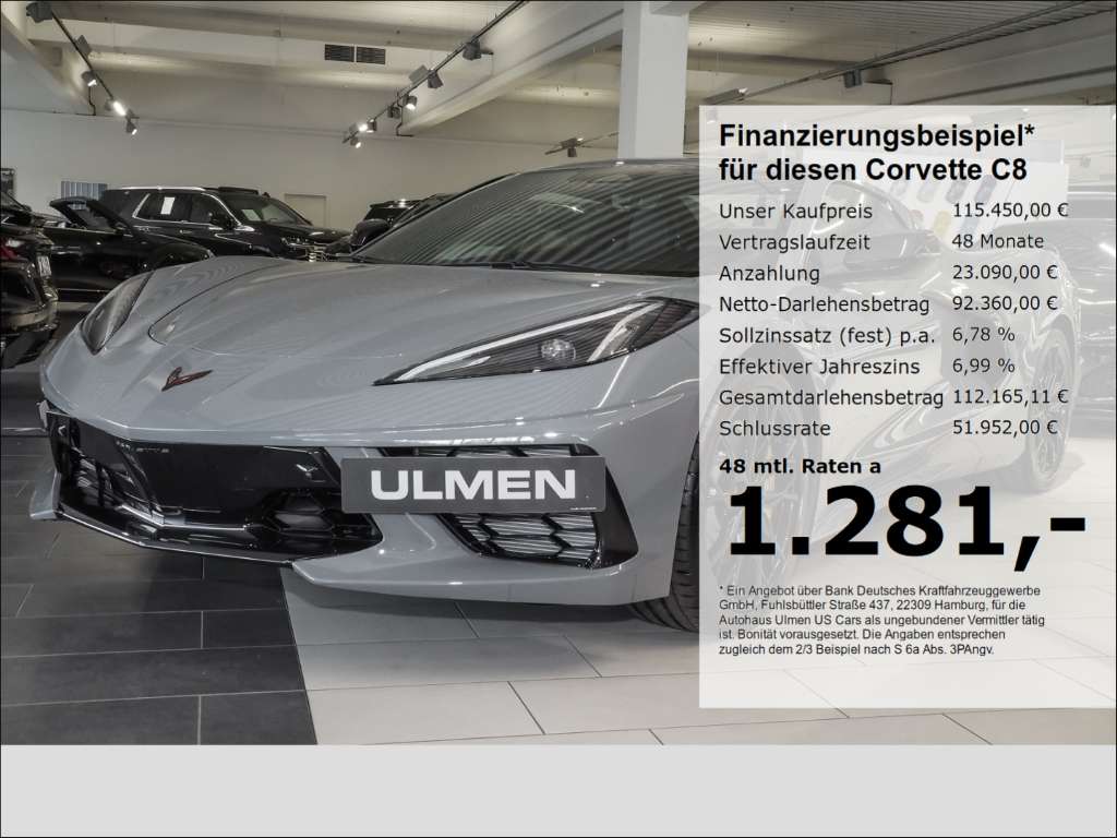 : AutomatikTechnik: Bordcomputer, Sperrdifferential, Adaptives Daempfungssystem, Partikelfilter, Sportabgasanlage, Schaltwippen, Volldigitales KombiinstrumentAssistenten: Totwinkel-Assistent, Lichtsensor, AusparkassistentKomfort: Klimaautomatik, Servolenkung, Zentralverriegelung, Elektrischer Fensterheber, Lederausstattung, Sitzheizung, Elektrische Aussenspiegel, Tempomat, Park Distance Control, Multifunktionslenkrad, Keyless Go Startfunktion, Elektrische Sitze, Mittelarmlehne, Innenraumfilter, Lenksaeule einstellbar, Sportsitze, Elektrisches Verdeck, klimatisierte Sitze, Keyless Entry, Memory Sitze, Lordosenstütze, Lederlenkrad, schwindigkeitsbegrenzungsanlage, Klimaautomatik-2-Zonen, FunkfernbedienungSicht: LED-Hauptscheinwerfer, LED-Tagfahrlicht, HEAD-UP-Display, LED-Rueckleuchten, Colorverglasung, Aussenspiegel beheizbar, RückfahrkameraSicherheit: ABS, Airbag, Seitenairbags, Alarmanlage, ESP, Reifendruckkontrolle, Traktionskontrolle, Kopfairbag, Panik-Alarmfunktion, Notrufsystem, PannenkitEntertainment: Soundsystem, Radio, Telefonvorbereitung, USB-Anschluss, Bose, Bluetooth, Freisprecheinrichtung, Apple CarPlay, Android Auto, Sprachsteuerung, DAB, WLAN, Touchscreen, Induktionsladen für SmartphonesUmwelt: Grüne UmweltplaketteQualität: Garantie, NichtraucherfahrzeugSonstiges: Alufelgen, Elektrische Parkbremse, Lenkradheizung, FahrerprofilauswahlWeiteres: Corvette Stingray 6.2 V8 Cabriolet, 3LT, Modelljahr 2024 mit COC-Papiere. Sonderausstattung: FE4 Magnetic Selective Ride Control TM Fahrwerk GXA Außen-Farbe: Sea Wolf Gray HTE Innenausstattung = Leder Jet Black ZYC Heck-Spoiler und Außenspiegel in Carbonschwarz lackiert AH2 GT2 Sport-Sitze J6E gelbe Bremssättel FA5 Carbon Interieur BAZ Alu-Dekore in anthrazit Q9I 20 Speichen LM-Räder black E60 Front Lift System Z51-Performance-Fahrwerk, Z51-Performance-Brembo®-Bremsen, Michelin® Pilot® Sport 4S, 245/35ZR19 vorn und 305/30ZR20 hinten, Hochleistungs-NotlaufSommerreifen, Elektronisch geregeltes Sperrdifferential (eLSD), Performance-Auspuff, Performance-Hinterachsübersetzung, Hochleistungskühlsystem, Z51-Heckspoiler in Karosseriefarbe, Z51-Frontsplitter Serienausstattung: Einstellbare Lenksäule, Elektr. Aussenspiegel, Elektr. Fensterheber, Elektr. Sitze, Elektr. Verdeck, Funkfernbedienung, schwindigkeitsbegrenzer, Innenraumfilter, Keyless Entry, Keyless Go, Klimaautomatik-2-Zonen, Klimasitze, Lederausstattung, Lederlenkrad, Lenkradheizung, Lordosenstütze, Memory Sitze, Mittelarmlehne, Multifunktionslenkrad, Park Distance Control, Servolenkung, Sitzheizung, Sportsitze, Tempomat, Zentralverriegelung, Android Auto, Apple CarPlay, Bluetooth, Bose, DAB, Freisprecheinrichtung, Induktionsladen, Navigation nur über Apple CarPlay oder Androis Auto möglich, Radio, Soundsystem, Sprachsteuerung, Telefonvorbereitung, Touchscreen, USB-Anschluss, WLAN, Beheizbare Außenspiegel, Colorverglasung, HEAD-UP-Display, LED-Hauptscheinwerfer, LED-Rückleuchten, LED-Tagfahrlicht, Rückfahrkamera, Tagfahrlicht, ABS, Airbag, Alarmanlage, ESP, Kopfairbag, Notrufsystem, Panik Alarmfunktion, Pannenkit, Reifendruckkontrolle, Seitenairbags, Traktionskontrolle, Adaptives Dämpfungssystem, Bordcomputer, digitales Kombiinstrument, Partikelfilter, Schaltwippen, Sperrdifferential, Sportabgasanlage, Alufelgen, Elektrische Parkbremse, Fahrerprofilauswahl, Ausparkassistent, Lichtsensor, Totwinkelassistent, 3 Jahre Hersteller-Garantie laut Garantiebedingungen, NichtraucherfahrzeugÄnderungen, Zwischenverkauf und Irrtümer vorbehalten. Das Autohaus Ulmen-Team und ich freuen sich auf Ihren Besuch. Die Angaben in Anzeigen, Internet und Bildern sind unverbindliche Beschreibungen und dienen nicht als zugesicherte Eigenschaften. Der Verkäufer übernimmt keine Haftung für Tipp und Datenübermittlungsfehler. Aufgeführte Ausstattungen sind immer gesondert zu prüfen. Irrtümer und Zwischenverkauf vorbehalten!