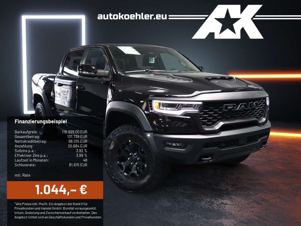 -Nr.: 000-KW_D_DEntdecken Sie den neuen 2025 RAM 1500 RHO bei uns im Autohaus Köhler in Potsdam!Der brandneue RAM 1500 RHO ist da – und setzt neue Maßstäbe in Sachen Leistung, Design und Vielseitigkeit. Als Europapremiere exklusiv in unserem Autohaus in Potsdam präsentiert, steht dieses beeindruckende hrzeug ab sofort für Sie zur Bestellung bereit.Optional sind exklusive AK Customs Umbauten möglich:-AK Customs Bügel-20 Zoll La Chanti Radsatz mit Offroadbereifung und Alpine Symbol-Laderaumabdeckung -KlappenabgasanlageLeistungsstärke, die begeistertDer 2025 RAM 1500 RHO überzeugt mit modernster Technologie und kraftvollen Leistungsdaten:Ausgestattet mit dem leistungsstarken 3.0L Hurricane Reihen-Sechszylinder Biturbo Motor mit 547 PS, 2s 0-100 Km/h., Effizienz und Luxus auf hoechstem Nivea und ist deutlich agiler im Gelaende als sein Vorgaenger der TRX., Komfort und modernster Technologie. Ideal fuer Abenteurer und die jenigen, die das Beste aus einem pick up herausholen wollen. , Ihr neuer RAM wartet auf Sie!, Modell: Dodge RAM RHO, * Generation 6 MY 2025, * Abgasanlage mit X-Pipes, * carbon interieur, * Bilstein Blackhawk Aktiveridefahrwerk, 4-Zoll-Touchscreen mit Apple CarPlay und Android Auto (neu ab Gen6), * elektrische Heckklappe per Knopfdruck automatisch oeffnend und schliessend (neu ab Gen 6), * vollelektrische Massagesitze (neu ab Gen 6), * LED Scheinwerfer neues Design (neu ab Gen 6), * neue Rueckleuchten (neu ab Gen 6), * 18 RHO Leichtmetallraeder ( neu ab Gen 6), * Motor: 3.0L Hurricane Reihensechszylinder Biturbo mit 547 PS 706NM (neu ab Gen 6), 25 Zoll beifahrer display (neu ab Gen 6), * 1.000kg Ladeflaeche Zuladung moeglich (neu ab Gen 6), * Dual Charging Pad (kabelloses Laden von 2 Smartphones/IPads), * Antrieb: Allradantrieb (4WD), *Ausstattungspakete:WinterpaketSportpaketGarantie&Qualitätssiegel:GarantieAssistenzsysteme:AbstandsregeltempomatTotwinkel-AssistentFernlichtassistentEinpa hintenRückfahrkameraAuffahrwarnerBerganfahrassistentLichtsensorRegensensorEinparkhilfe vorneSpurhalteassistentLicht:LED ScheinwerferKurvenlichtLED TagfahrlichtNebelscheinwerfer-/FunktionMedia & Infotainment:Navigation / Online NavigationTouchscreen-DisplaySoundsystemRadioiPod®/iPhone®/Android SchnittstelleUSB-Schnittstelle/AnschlussBluetooth SchnittstelleFreisprecheinrichtungApple Car Play / VorbereitungInduktionsladeschale für Smartphone / Wireless ChargingSicherheit & Technik:elektronisches Stabilitäts Programm (ESP)BeifahrerairbaghrerairbagSeitenairbags vornaktiver BremsassistentAlarmanlageAntiblockiersystem (ABS)Antriebsschlupfregelung (ASR)WegfahrsperreKomfort & Klima:Keyless Entryelektrische Sitzverstellung hrer/BeifahrerSitzbelüftungTelematik/Notrufsystem (Vorbereitung)BordcomputerInnenspiegel automatisch abblendendHead-Up DisplayLordose / Lendenwirbelstützeelektr. Spiegelelektrische FensterheberISOFIX KindersitzbefestigungZentralverriegelung(2-Zonen Klimaautomatik)4xSitzheizungMittelarmlehneServolenkungSmart Mirror View / digitaler InnenspiegelReifen & Felgen:AlufelgenReifendruck-KontrolleSommerreifenExterieur & Design:AHK abnehmbarInterieur & Design:LenkradheizungSchiebedachPanoramadachvirtuelle InstrumenteLederlenkradMultifunktionslenkradAmbientebeleuchtungBedienelemente am LenkradUmwelt & Laden:EURO 6dStart/Stopp AutomaticUmweltplakette 4Getriebe:AutomatikWeitere Informationen:Nichtraucherfahrzeugunfallfrei