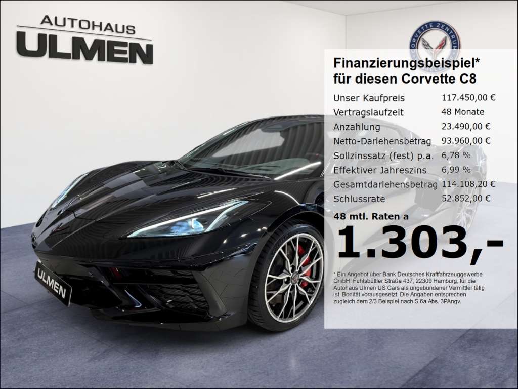 : AutomatikTechnik: Bordcomputer, Sperrdifferential, Adaptives Daempfungssystem, Partikelfilter, Sportabgasanlage, Schaltwippen, Volldigitales KombiinstrumentAssistenten: Totwinkel-Assistent, Lichtsensor, AusparkassistentKomfort: Klimaautomatik, Servolenkung, Zentralverriegelung, Elektrischer Fensterheber, Lederausstattung, Sitzheizung, Elektrische Aussenspiegel, Tempomat, Park Distance Control, Multifunktionslenkrad, Keyless Go Startfunktion, Elektrische Sitze, Mittelarmlehne, Innenraumfilter, Lenksaeule einstellbar, Sportsitze, Elektrisches Verdeck, klimatisierte Sitze, Keyless Entry, Memory Sitze, Lordosenstütze, Lederlenkrad, schwindigkeitsbegrenzungsanlage, Klimaautomatik-2-Zonen, FunkfernbedienungSicht: LED-Hauptscheinwerfer, LED-Tagfahrlicht, HEAD-UP-Display, LED-Rueckleuchten, Colorverglasung, Aussenspiegel beheizbar, RückfahrkameraSicherheit: ABS, Airbag, Seitenairbags, Alarmanlage, ESP, Reifendruckkontrolle, Traktionskontrolle, Kopfairbag, Panik-Alarmfunktion, Notrufsystem, PannenkitEntertainment: Soundsystem, Radio, Telefonvorbereitung, USB-Anschluss, Bose, Bluetooth, Freisprecheinrichtung, Apple CarPlay, Android Auto, Sprachsteuerung, DAB, WLAN, Touchscreen, Induktionsladen für SmartphonesUmwelt: Grüne UmweltplaketteQualität: Garantie, NichtraucherfahrzeugSonstiges: Alufelgen, Elektrische Parkbremse, Lenkradheizung, FahrerprofilauswahlWeiteres: Corvette Stingray 6.2 V8 Cabriolet, 3LT, Modelljahr 2024. Sonderausstattung: FE4 Magnetic Selective Ride Control TM Fahrwerk, GBA Außen-Farbe: Schwarz, HTT Innenausstattung = Leder Nappa Jet Black Sitzinnenfläche und Lenkrad in Alcantara, AH2 GT2 Sport-Sitze, 38S rote Ziernähte, J6F rote Bremssättel, BAZ Alu-Dekore in anthrazit, Q99 20 Speichen LM-Räder silber, E60 Front Lift System, ERI Batterie-Schutz-Paket, Z51-Performance-Fahrwerk, Z51-Performance-Brembo®-Bremsen, Michelin® Pilot® Sport 4S, 245/35ZR19 vorn und 305/30ZR20 hinten, Hochleistungs-NotlaufSommerreifen, Elektronisch geregeltes Sperrdifferential (eLSD), Performance-Auspuff, Performance-Hinterachsübersetzung, Hochleistungskühlsystem, Z51-Heckspoiler in Karosseriefarbe, Z51-Frontsplitter Serienausstattung: Einstellbare Lenksäule, Elektr. Aussenspiegel, Elektr. Fensterheber, Elektr. Sitze, Elektr. Verdeck, Funkfernbedienung, schwindigkeitsbegrenzer, Innenraumfilter, Keyless Entry, Keyless Go, Klimaautomatik-2-Zonen, Klimasitze, Lederausstattung, Lederlenkrad, Lenkradheizung, Lordosenstütze, Memory Sitze, Mittelarmlehne, Multifunktionslenkrad, Park Distance Control, Servolenkung, Sitzheizung, Sportsitze, Tempomat, Zentralverriegelung, Android Auto, Apple CarPlay, Bluetooth, Bose, DAB, Freisprecheinrichtung, Induktionsladen, Navigation nur über Apple CarPlay oder Androis Auto möglich, Radio, Soundsystem, Sprachsteuerung, Telefonvorbereitung, Touchscreen, USB-Anschluss, WLAN, Beheizbare Außenspiegel, Colorverglasung, HEAD-UP-Display, LED-Hauptscheinwerfer, LED-Rückleuchten, LED-Tagfahrlicht, Rückfahrkamera, Tagfahrlicht, ABS, Airbag, Alarmanlage, ESP, Kopfairbag, Notrufsystem, Panik Alarmfunktion, Pannenkit, Reifendruckkontrolle, Seitenairbags, Traktionskontrolle, Adaptives Dämpfungssystem, Bordcomputer, digitales Kombiinstrument, Partikelfilter, Schaltwippen, Sperrdifferential, Sportabgasanlage, Alufelgen, Elektrische Parkbremse, Fahrerprofilauswahl, Ausparkassistent, Lichtsensor, Totwinkelassistent, 3 Jahre Hersteller-Garantie laut Garantiebedingungen, NichtraucherfahrzeugÄnderungen, Zwischenverkauf und Irrtümer vorbehalten. Das Autohaus Ulmen-Team und ich freuen sich auf Ihren Besuch. Die Angaben in Anzeigen, Internet und Bildern sind unverbindliche Beschreibungen und dienen nicht als zugesicherte Eigenschaften. Der Verkäufer übernimmt keine Haftung für Tipp und Datenübermittlungsfehler. Aufgeführte Ausstattungen sind immer gesondert zu prüfen. Irrtümer und Zwischenverkauf vorbehalten!