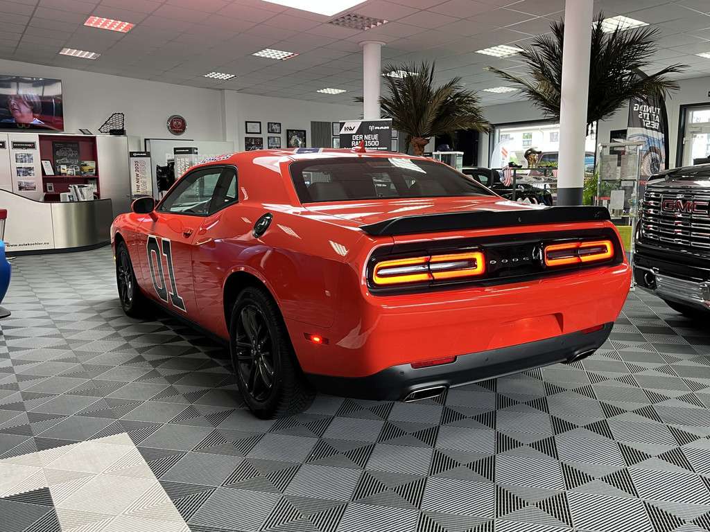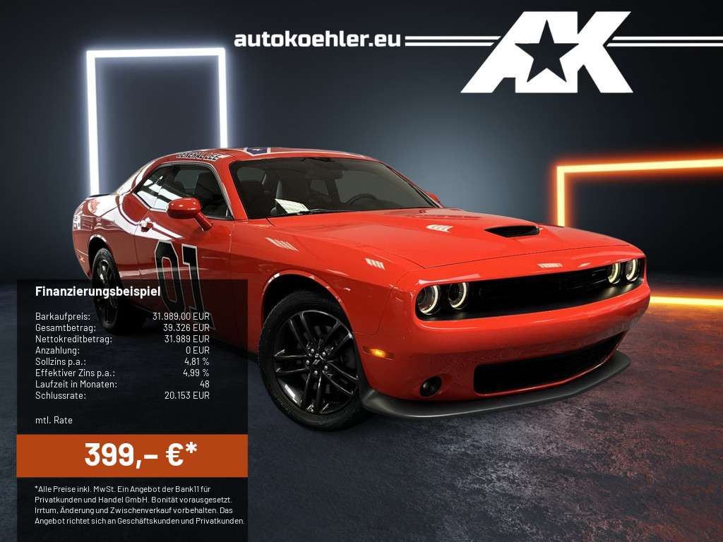 -Nr.: 056-INZ-KH535060 (056)Zum Verkauf steht ein einzigartiger Dodge Challenger SXT GT – echtes Muscle-Car-Feeling mit Gänsehaut-Garantie!Motorisierung & Ausstattung: kräftiger V6 mit Allradantrieb (GT-Version) – perfekter Mix aus Alltagstauglichkeit und SportlichkeitOptik: auffällige General Lee Folierung – garantiert ein absoluter Blickfang auf jeder StraßeSound: hochwertiger NAP-Klappenauspuff, der per Knopfdruck zwischen dezent und brachial wechseltZustand: gepflegt, unfallfrei, sofort fahrbereitBesonderheiten: sportliches Interieur, moderne Ausstattung, kultiger US-Car-CharakterDieser Challenger vereint pure Emotion mit Alltagstauglichkeit – egal ob für US-Car-Treffen, Wochenendtouren oder einfach, um täglich mit einem Grinsen im Gesicht zu fahren.Assistenzsysteme:AbstandsregeltempomatTotwinkel-AssistentFernlichtassistentEinparkhilfe hintenRückfahrkameraBerganfahrassistentLichtsensorRegensensorLicht:XenonLED (Teil)-RückleuchtenLED TagfahrlichtMedia & Infotainment:Navigation / Online NavigationTouchscreen-DisplaySoundsystemRadioiPod®/iPhone®/Android SchnittstelleUSB-Schnittstelle/AnschlussBluetooth SchnittstelleFreisprecheinrichtungSprachsteuerung-/BedienungApple Car Play / VorbereitungSicherheit & Technik:elektronisches Stabilitäts Programm (ESP)BeifahrerairbaghrerairbagSeitenairbags vornAlarmanlageAntiblockiersystem (ABS)Antriebsschlupfregelung (ASR)WegfahrsperreKomfort & Klima:Keyless Entryelektrische Sitzverstellung hrer/BeifahrerSitzbelüftungBordcomputerInnenspiegel automatisch abblendendScheinwerferreinigungsanlage (SRA)Lordose / Lendenwirbelstützeelektrische FensterheberISOFIX KindersitzbefestigungKlimaautomatikZentralverriegelung(2-Zonen Klimaautomatik)SitzheizungMittelarmlehneServolenkungSportsitz(e)Reifen & Felgen:AlufelgenReifendruck-KontrolleSommerreifenInterieur & Design:LenkradheizungLederlenkradMultifunktionslenkradBedienelemente am LenkradUmwelt & Laden:E10 geeignetKatalysatorGetriebe:AutomatikWeitere Informationen:NichtraucherfahrzeugunfallfreiZweitbesitzFinanzierungsbeispiel:*Ein Bank 11Ballonfinanzierung-Finanzierungsbeispiel der Bank11 für Privatkunden und Handel GmbH, Hammer Landstraße 91, 41460 Neuss für Privatkunden und Geschäftskunden: 399,44 EUR monatl. Rate, 4,99 Prozent eff. Jahreszins bei 48 Monaten Laufzeit, einer Anzahlung von 0,00 EUR, einer jährlichen Laufleistung von 10.000 km und einer Schlussrate von 20.153,07 EUR. (Sollzins gebunden p.a. 4,81 Prozent, Bruttokreditbetrag: 39.326,19 EUR, Nettokreditbetrag: 31.989,00 EUR)Eine Besichtigung vor dem Kauf wird empfohlen.Die hrzeugbeschreibung dient lediglich der allgemeinen Identifizierung des hrzeuges und stellt keine Gewährleistung im kaufrechtlichen Sinne dar.Die Angaben erheben nicht den Anspruch auf Vollständigkeit, Irrtümer und Zwischenverkauf bleiben vorbehalten.Druckfehler, Eingabe Irrtümer und Änderungen/Zwischenverkauf sind vorbehaltenWinterradsatz optional erhältlich, Abschlusseiner Gebrauchtwagengarantie bis 24 Monate möglichAlle Angaben ohne Gewähr, Finanzierung und Inzahlungnahme über unsere Hausbank möglich, Leasing möglich, europaweite Lieferung möglich.Besuchen Sie uns auch unter www.autokohler.eu & ak-customs.de.