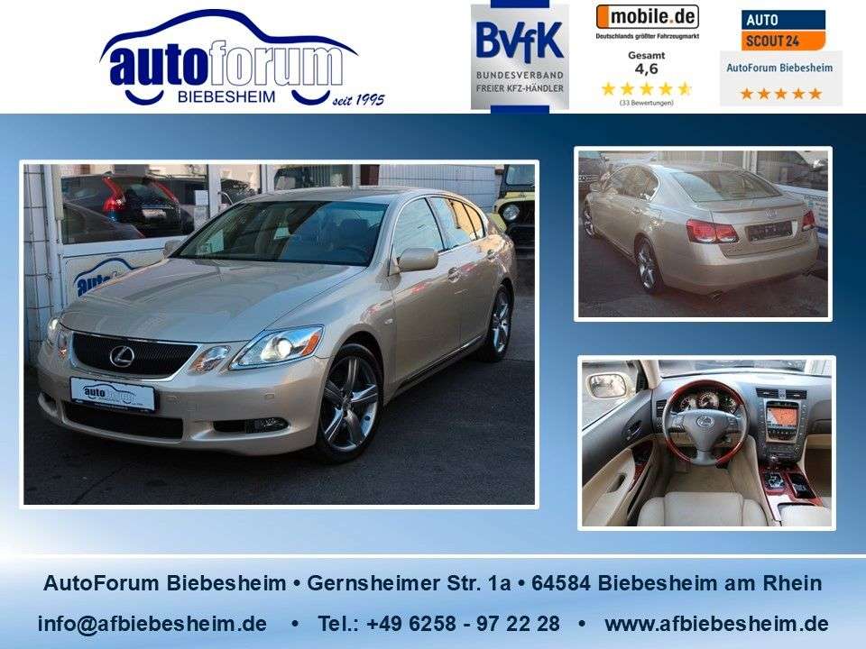 e Besichtigung und Probefahrt bitte einen Termin vereinbaren.TÜV/AU neu bei ÜbergabeFahrzeug hat 1 VorbesitzerScheckheft nur bei LexusScheckhefteinträge:09/09/2008 mit 9908 km Service14/05/2009 mit 21.905 km Service14/07/2010 mit 28.200 km Service24/11/2011 mit 41.410 km Service14/03/2014 mit 58.156 km Service19/02/2015 mit 64.908 km Service22/04/2016 mit 71.382 km Service27/03/2017 mit 77.556 km Service11/05/2018 mit 84.288 km Service17/02/2020 mit 97.518 km Service04/2021 mit 101.257 km Service04/2022 mit 105.296 km ServiceXenon-Scheinwerfer mit Adaptive Front-Lighting-System (AFS)DVD-Navigationssystem mit Touchscreen-FarbdisplaySitzbezug/Polsterung: Leder beigeSitzheizung vornSitze vorn elektr. verstellbar, links mit MemoryKlimaautomatik mit autom. Umluft-ControlTempomatEinparkhilfe hintenLenkrad (Holz/Leder)Mica-LackierungAirbag Beifahrerseite abschaltbarAirbag Fahrer-/BeifahrerseiteAutomatische Stabilitäts-Control und Traktion (ASC + T)Außenspiegel elektr. verstell- und heizbarAußenspiegel mit AbblendautomatikAußentemperaturanzeigeBordcomputerFahrwerk Adaptive variabel (Avs)Fensterheber elektrisch vorn + hintenFrontscheibe mit Bandfilter obenHeckspoilerInnenausstattung: EdelholzInnenspiegel mit AbblendautomatikIntegriertes Fahrdynamik-ManagementIsofix-Aufnahmen für KindersitzKarosserie: 4-türigKnieairbag BeifahrerseiteKnieairbag FahrerseiteKopf-Airbag-SystemLM-FelgenMotor 4,3 Ltr. - 208 kW V8 32V KATReifensystem Run-Flat (mit Notlaufeigenschaften)Schalt-/Wählhebelgriff Holz/LederSchleudertrauma-SchutzsystemSchwellerschutzleistenSeitenairbag hintenSeitenairbag vornSeitenscheiben wasserabweisendSonnenschutzrollo an HeckscheibeWärmeschutzverglasung getöntBitte beachten Sie, dass wir für dieses Fahrzeug aufgrund des Fahrzeugalters keine Garantie anbieten können, daher bevorzugt an Gewerbetreibende.Unsere Dienstleistungen/Service:Inzahlungnahme zu fairen PreisenFinanzierung auch ohne Anzahlung möglichKurzzeitkennzeichen 5-Tage möglichAusfuhrkennzeichen möglichZulassungsdienst (An- und Abmeldung) möglichSämtliche Angaben zu den inserierten Fahrzeugen sind unverbindlich. Irrtümer, Schreibfehler und Zwischenverkauf vorbehalten. Alle Angaben ohne Gewähr.
