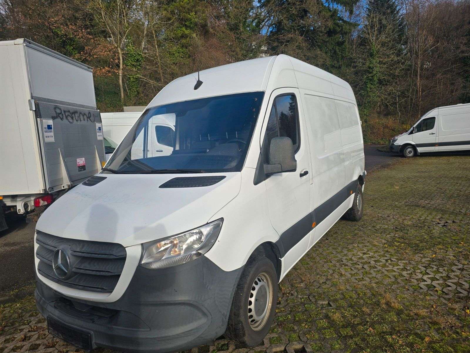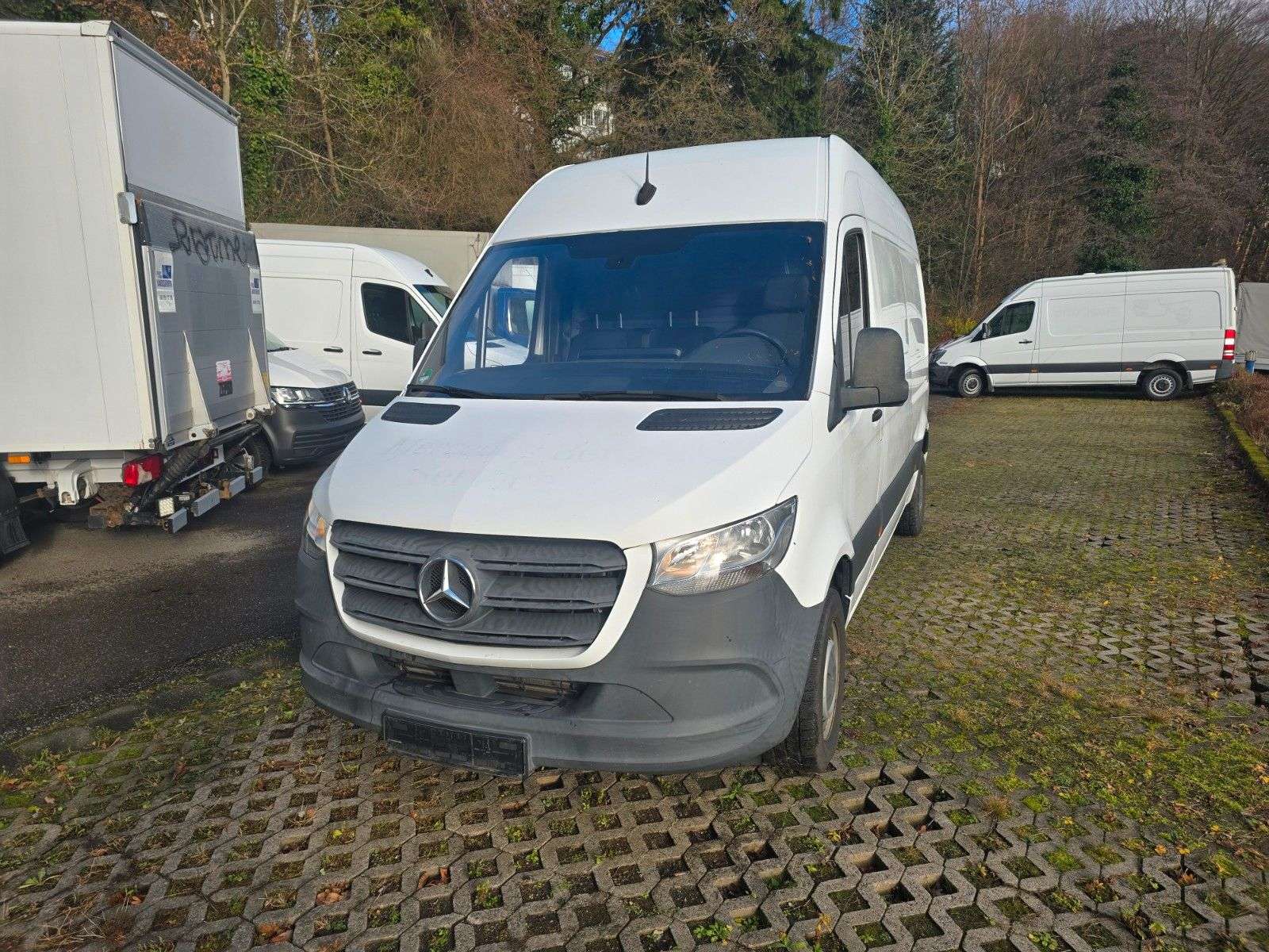 sstattung:Ablagefach oberhalb Frontscheibe, Airbag Beifahrerseite, Anhängerkupplung: Elektrik für Anhängersteckdose, Beifahreroptimierte Schaltkonsole (ohne Ablagefach Mittelkonsole rechts), Bodenbelag: Kunststoff im Lade-/Fahrgastraum, Fahrwerk: Stabilisierung Stufe I, Feststellbremse elektrisch, Hecktür (Öffnungswinkel 270 Grad), Kombiinstrument mit Farbdisplay, Kraftstofftank mit Falschbetankungsschutz, Kühlergrillrahmen Wagenfarbe, Lade-Paket Armaturentafel (USB-Anschlüsse und Steckdose 12V-Anschluß zusätzlich), Leitungskanal an Heckportal, Leitungskanal an Seitenwand, Markierungsleuchten seitlich, Multimediasystem MBUX (Touchscreen 7"), Reserverad in Fahrbereifung, Reserveradhalter unter Rahmenende inkl. Wagenheber, Rückfahrkamera, Scheibenwischer mit Regensensor, Sicherheitsgurt-System mit Warnanlage (Beifahrerseite), Sitze im Fahrerhaus: Beifahrerdoppelsitz, Sitze im Fahrerhaus: Fahrersitz heizbar, Sitze im Fahrerhaus: Fahrersitz Komfort, Tankdeckel rot, Trittstufe Hecktür, Verkleidung im Lade-/FG-Raum: Holz hoch (bis Dach), Verzurrschienen im Laderaum - Seitenwand an Brüstungsgurt, Verzurrschienen im Laderaum - Seitenwand an Dachrahmen, Vorderachse verstärkt, WagenheberWeitere Ausstattung:3. Bremsleuchte, Adaptives Bremslicht, Airbag Fahrerseite, Antriebs-Schlupfregelung (ASR), Anzeige für Waschwasserstand, Außentemperaturanzeige, Bremsassistent, Dachverkleidung im Fahrerhaus, Einschaltautomatik für Fahrlicht, Einstiegsgriff für Schiebetür an Laderaumtrennwand, Elektr. Bremskraftverteilung (EBV), Fahrassistenz-System: Seitenwind-Assistent, Getriebe 6-Gang - FSG, Karosserie/Aufbau: Kasten Hochraum Standard, Keyless-Start, Kindersicherung, Kommunikationsmodul (LTE) für digitale Dienste, Kraftstofftank: Haupttank 65 Ltr., Laderaumtrennwand durchgehend, Leuchtweitenregelung, LKW-Zulassung, Mercedes-Benz Notrufsystem, Motor 2,1 Ltr. - 105 kW CDI KAT, Radstand 3924 mm, Schadstoffarm nach Abgasnorm Euro 6, Schiebetür Lade-/Fahrgastraum rechts, Sicherheitsgurt-System mit Warnanlage (Fahrerseite), Sitzbezug / Polsterung: Stoff, Stahlfelgen 6,5x16, Vlies-Batterie 70 Ah, Wartungsintervall-Anzeige Assyst, Zul. Gesamtgewicht 3,50 t