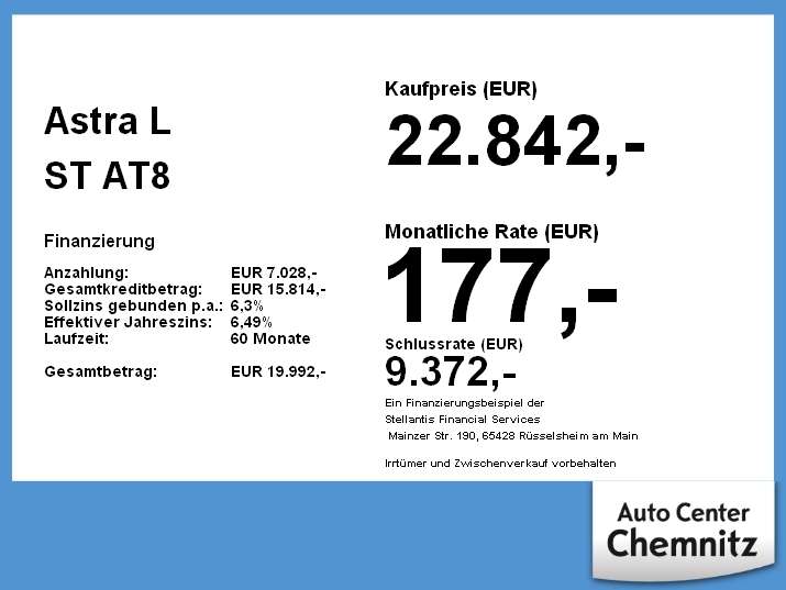 prechpartner für dieses KFZ: Shania Köhler, Tel: 0371 - 27144 24 Danny Dathe, Tel: 0371 27144 17 Reza Nassir, Tel: 0371-27144514 Matthias Pätzold, Tel: 0371/27144 512 Hendrik Scheibe, Tel: 0371 27144-91 Christopher Körner, Tel: 0371-2714442 Mirko Engel, Tel: 0371 / 27144 23Fahrzeugnummer: GW-072591Ehemalige unverbindliche Preisempfehlung des Automobilherstellers: 42.844 EUR (ca. -47%)1. Hand, unfallfrei, scheckheftgepflegt, Nichtraucher *Ehemalige unverbindliche Preisempfehlung des Automobilherstellers: 42.844 EUR (ca. -47%) letzter Service 11.2025 bei 27.781 km, HIGHLIGHTS & PAKETEInfotainment-PaketASSISTENZSYSTEMEParkpilotsystem vorn und hintenFrontkamera inkl. Adaptive GeschwindigkeitsregelanlageAdaptive Geschwindigkeits-Regelanlage (Tempomat) Autonomer Notbrems-Assistent und FrontkameraAutonomer Notbrems-Assistent mit Frontkollisionswarnung und FussgängererkennungQuerverkehrs-Assistent Heck (Rückfahr-Assistent)SpurhalteassistentVerkehrszeichenerkennungAktiver Spurhalteassistent (Lenkunterstützung)Müdigkeitserkennungs-SensorFrontkollisionswarnungLeuchtweitenregelung automatischMOTOR GETRIEBE & FAHRWERKStart/Stop-AnlageAnti-Blockier-System (ABS)Elektron. Stabilitäts-Programm (ESP)RusspartikelfilterAUDIO & KOMMUNIKATIONMultimedia Navi Pro (10 Display)* Head-up-Display* HiFi-Soundsystem inkl. Subwoofer* DAB-Tuner (Radioempfang digital)* Smartphone Schnittstelle (Apple CarPlay & Android Auto)* Freisprecheinrichtung (Bluetooth) mit SprachsteuerungINTERIEUR* Schiebe-/Hebedach elektrisch (Glas)* Sitzheizung vorn* Lenkrad heizbar* Ergonomiesitz vorn links* Sitzverstellung vorn links (8-fach)* Sitzverstellung vorn rechts (6-fach)* Klimaautomatik 2-Zonen* Fensterheber vorn elektr. mit Einklemmschutz* Induktionsladeschale für Smartphone (Wireless Charging)* Seitenairbag vorn* Gepäckraum-Abtrennung (Netz)* Innenspiegel mit Abblendautomatik* Lenkrad (Leder)* Mittelarmlehne hinten* Mittelarmlehne vorn mit Ablagefach* Rücksitzlehne geteilt (40:20:40)* Steckdose (12V-Anschluss) in MittelkonsoleLICHT & SICHT* Scheinwerfer LED Eco* Fernlichtassistent* Einschaltautomatik für Fahrlicht* Nebelscheinwerfer LED* Tagfahrlicht LED* Heckleuchten LED* Scheibenwischer mit RegensensorRÄDER* Reifendruck-KontrollsystemTECHNIK & SICHERHEIT* Kamerasystem 360%B0* Schliess-/Startsystem Keyless Open* Zentralverriegelung mit Fernbedienung* Feststellbremse elektrisch* Opel Connect* Bremsassistent* Akustischer Fussgängerschutz (Aussensound)* Elektr. Bremskraftverteilung (EBD)* Airbag Fahrer-/Beifahrerseite* Kopf-Airbag-System* Isofix-Aufnahmen für Kindersitz an RücksitzEXTERIEUR* Frontscheibe heizbar (ThermaTec)* Heckklappenöffnung elektrisch* Wärmeschutzverglasung hinten abgedunkelt (Solar-Protect)* Metallic-/Mineraleffekt-LackierungSONSTIGE AUSSTATTUNGEN* Karosserie: 5-türig* Reifen-Reparaturkit* Schadstoffarm nach Abgasnorm Euro 6eWeitere Merkmale* Getriebe Automatik - mit Start-/Stop (8-Stufen)* Lendenwirbelstütze Sitz vorn links - elektr. verstellbar* Aussenspiegel elektr. verstell- und heizbar - elektr. anklappbar* LM-Felgen 7.5x17 (5-Speichen - schwarz)* Berganfahr-Assistent (HSA - Hill Start Assist) Als Vertragshändler bieten wir nen besten Service und kompetente Beratung zu allen Fragen rund ums Automobil. Bitte kontaktieren Sie uns wir freuen uns auf ren Anruf. Änderungen Irrtümer und Zwischenverkauf vorbehalten. Alle Angaben ohne Gewähr. Keine Haftung für Druck-Tipp-Ausstattungs-und Schreibfehler.